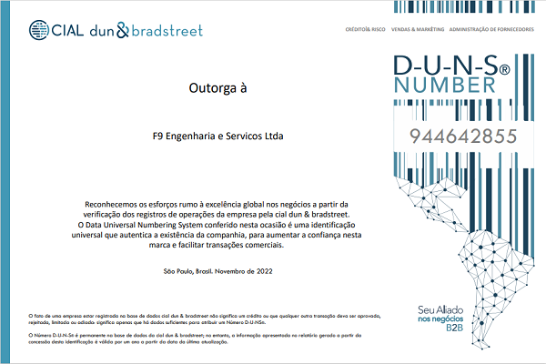 Além de qualidade para obter ainda mais confiança com o cliente, obtemos o selo CIAL Dun & Bradstreet o que garante que a F9 Demolições é uma empresa legítima. Garantindo aos clientes e novos parceiros confiança e segurança em nossa empresa.